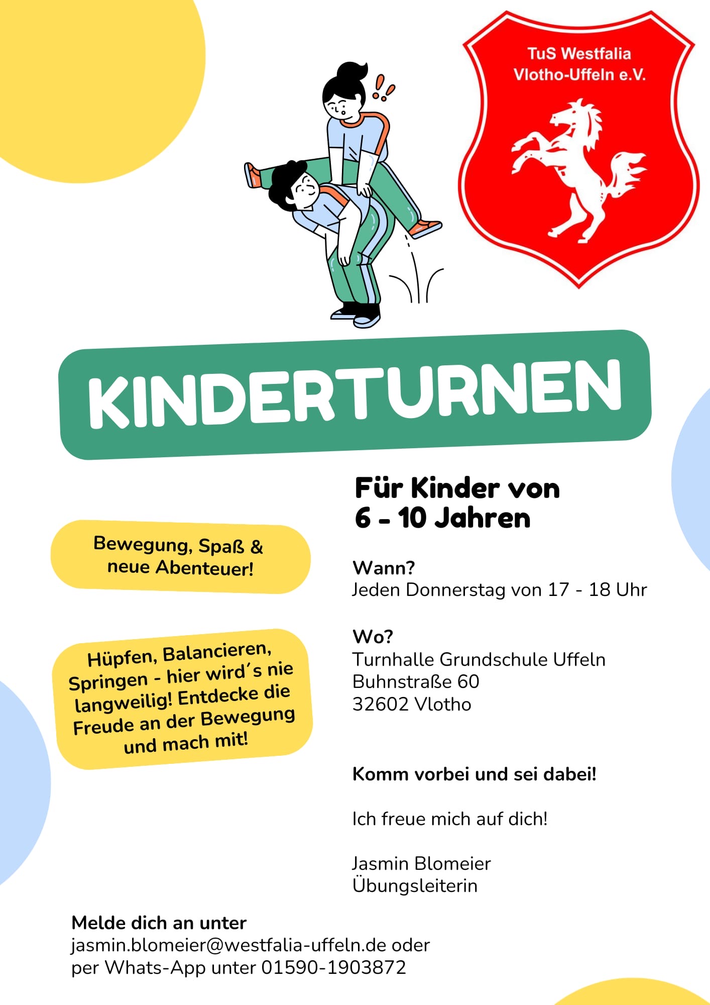 Beim Kinderturnen stehen Spaß, Bewegung und abwechslungsreiche Übungen im Vordergrund. In einer altersgerechten Umgebung können die Kinder ihre motorischen Fähigkeiten stärken, Selbstvertrauen aufbauen und gemeinsam mit anderen Kindern aktiv sein.